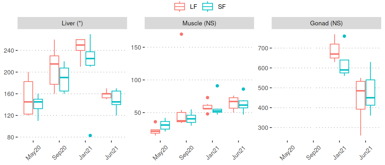 This page presents the findings from our analysis of broodstock samples during the saltwater period, focusing on two different feed types. The two feed types are:
