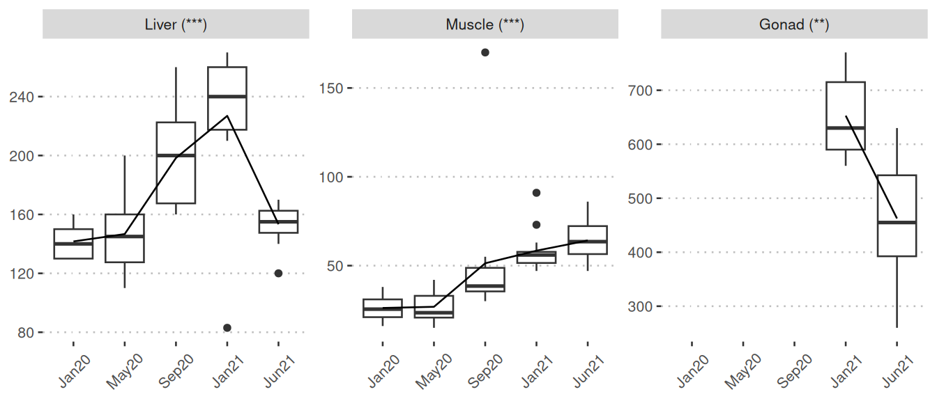 Significant: The boxplots visually represent nutrient/metabolite levels across five sampling points. These boxplots are only displayed when at least one comparison is identified as significant. The boxplots connect mean values of months through lines. The five sampling points are: