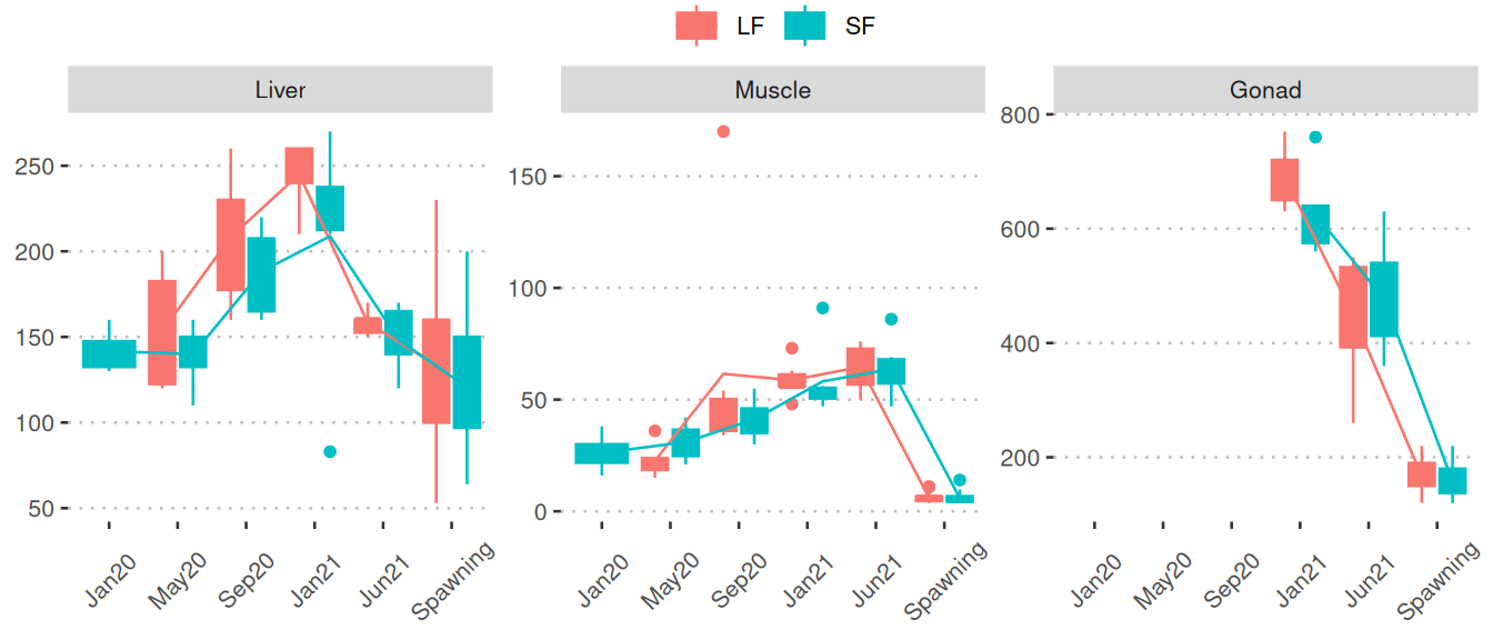 Boxplots of the phase 2 samples (spawning/offspring): Boxplots show nutrient/metabolite levels separated by LF (red) and SF (blue) among the three final sampling points for various tissues. Mean values of months are connected by lines. The final sampling points are categorized as: