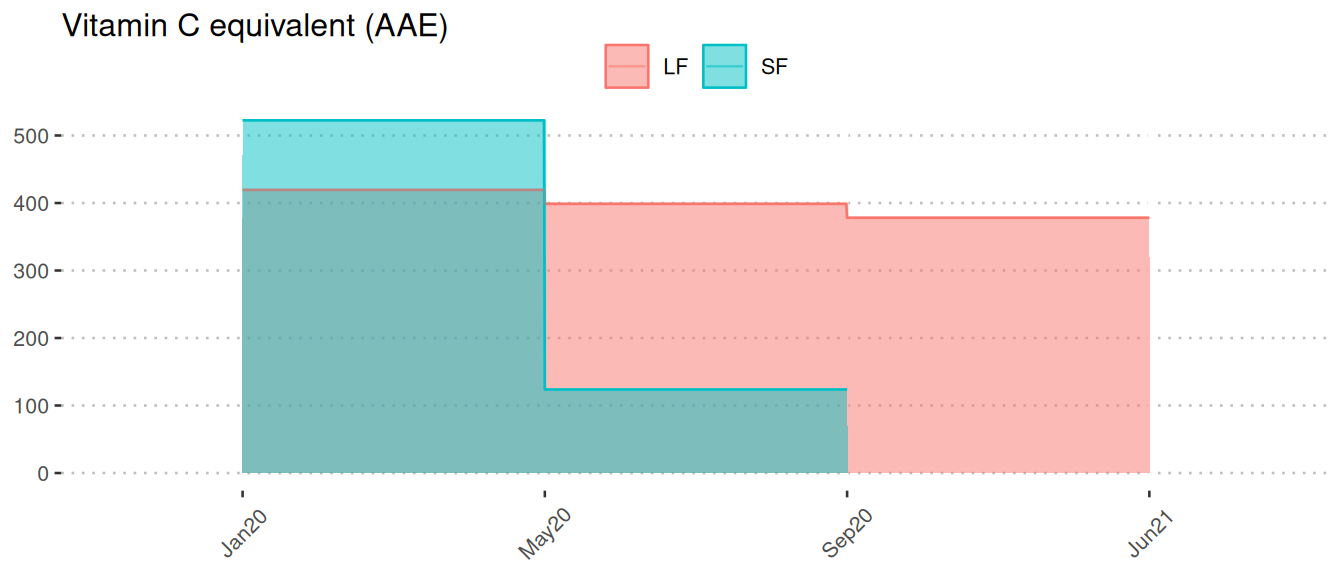Concentration of the corresponding nutrient in feed: A plot illustrates the concentration of the corresponding nutrient/metabolite during the saltwater period (January 2020 - June 2021). It distinguishes between long-term feeding (LF, red) and short-term feeding (SF, blue).