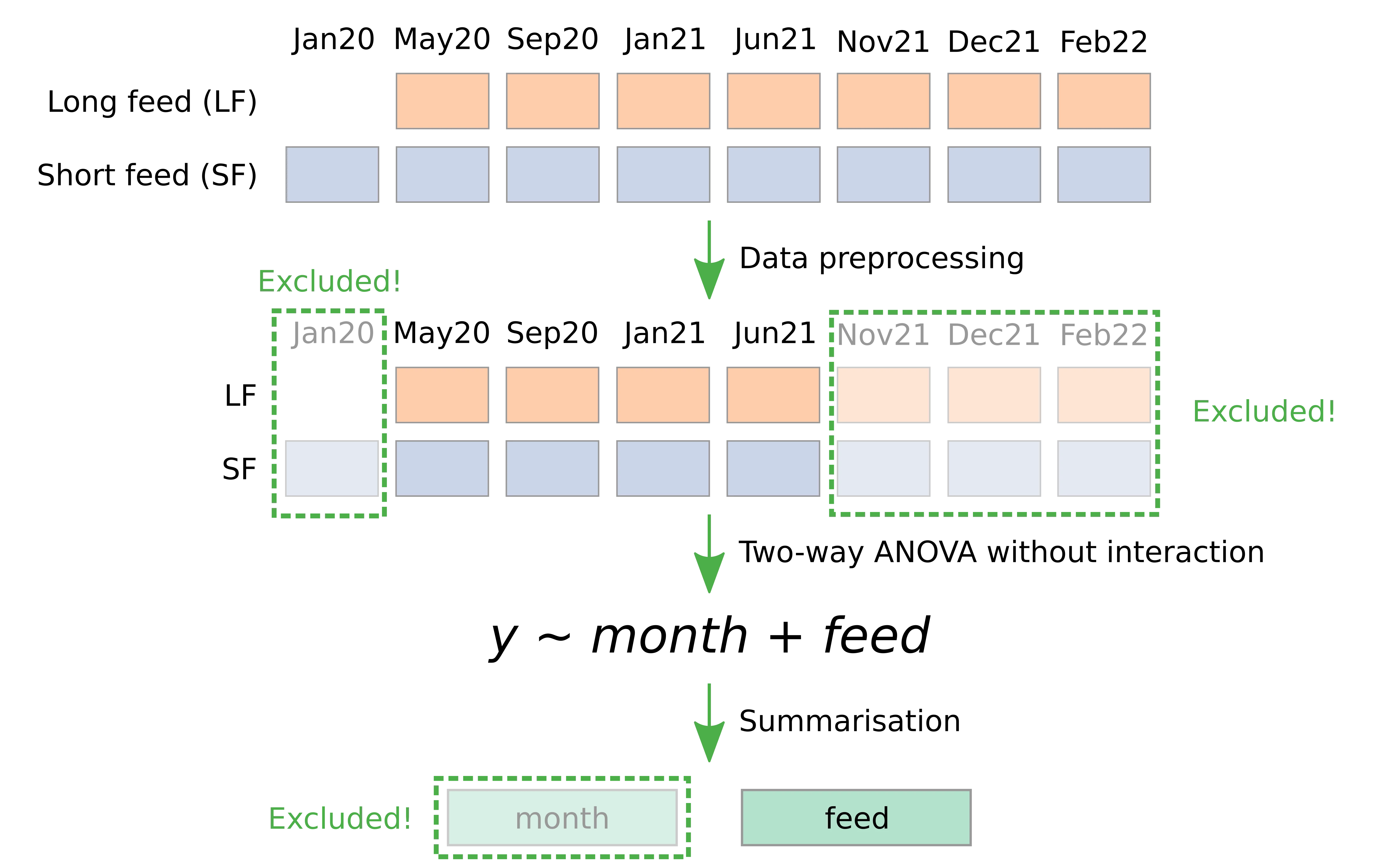 - Independent variables: month and feed.