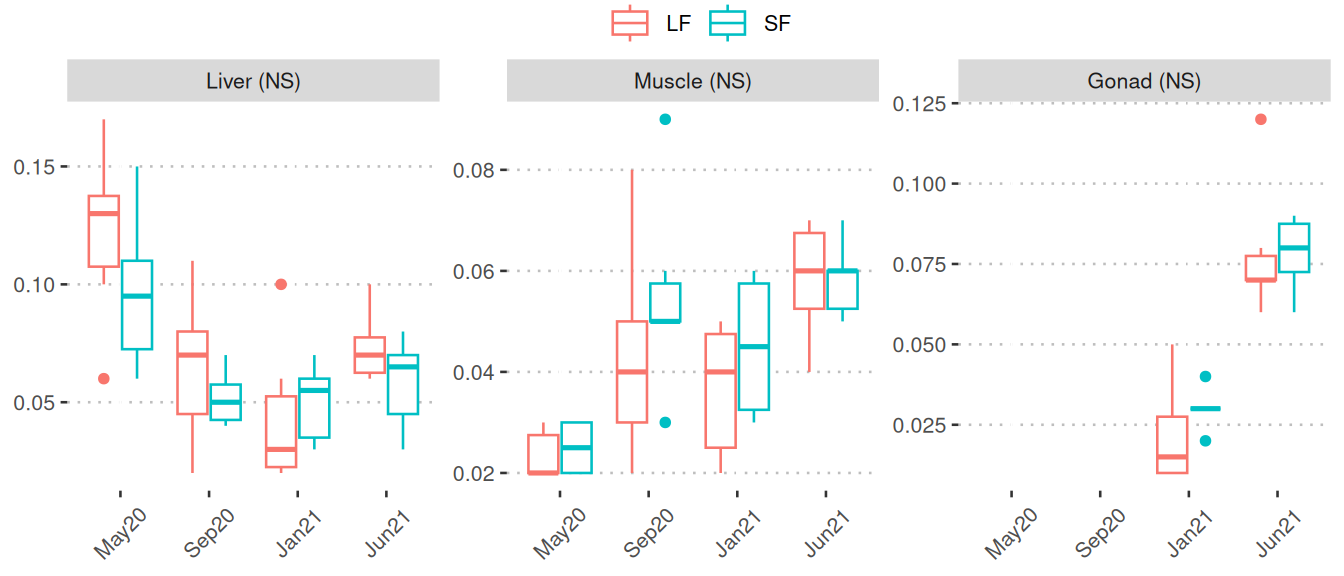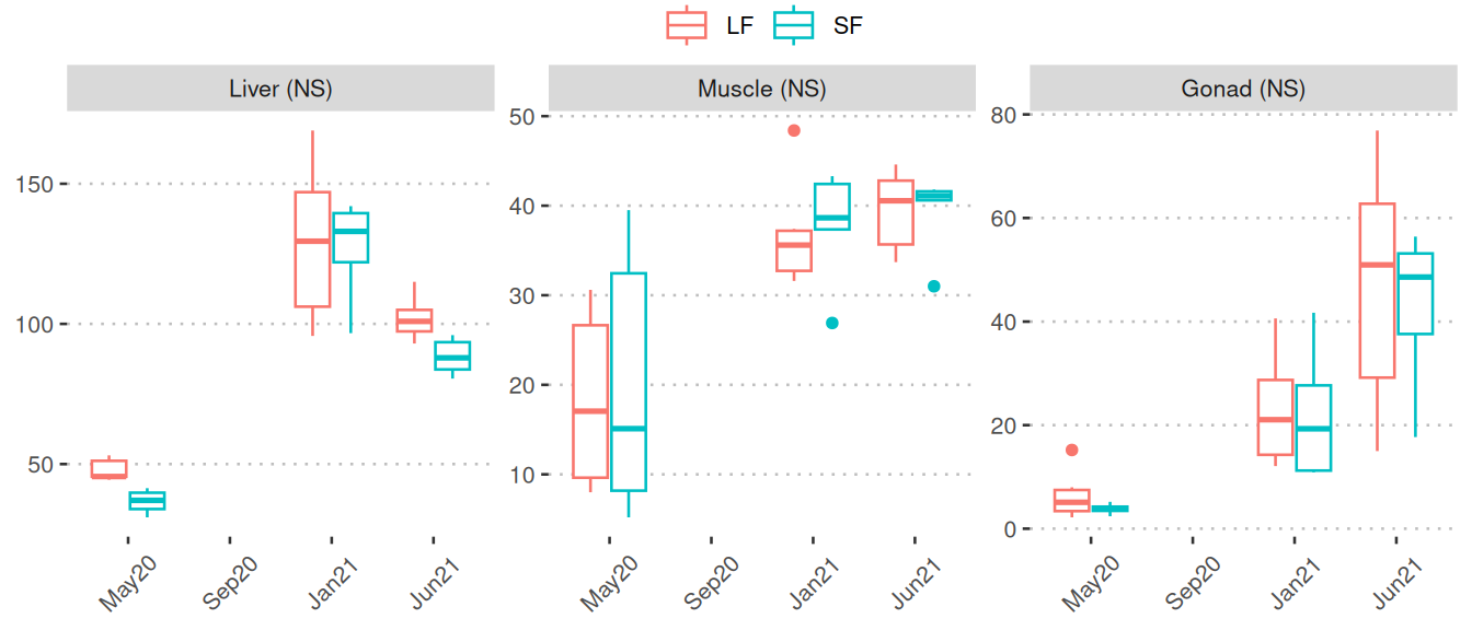 This page presents the findings from our analysis of broodstock samples during the saltwater period, focusing on two different feed types. The two feed types are: