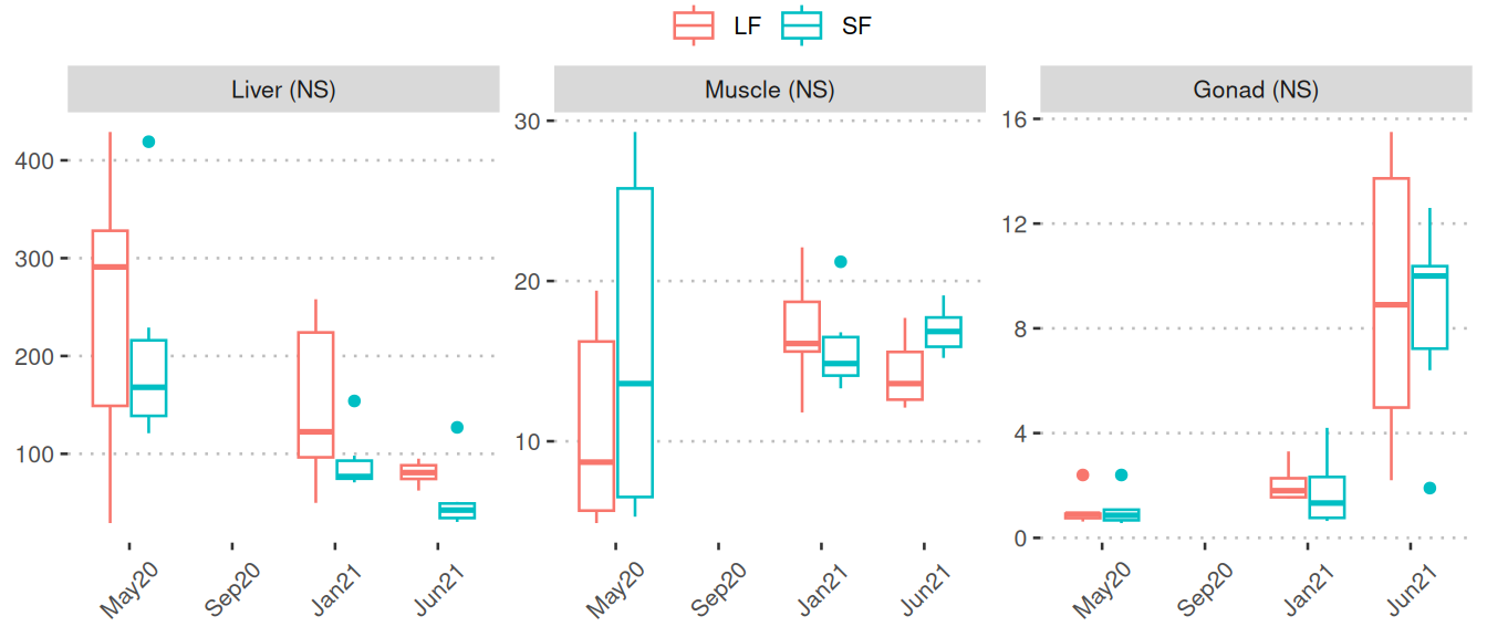 Significant: The boxplots visually represent nutrient/metabolite levels separated by LF (red) and SF (blue) across four sampling points. These boxplots are only displayed when at least one comparison is identified as significant. The four sampling points are: