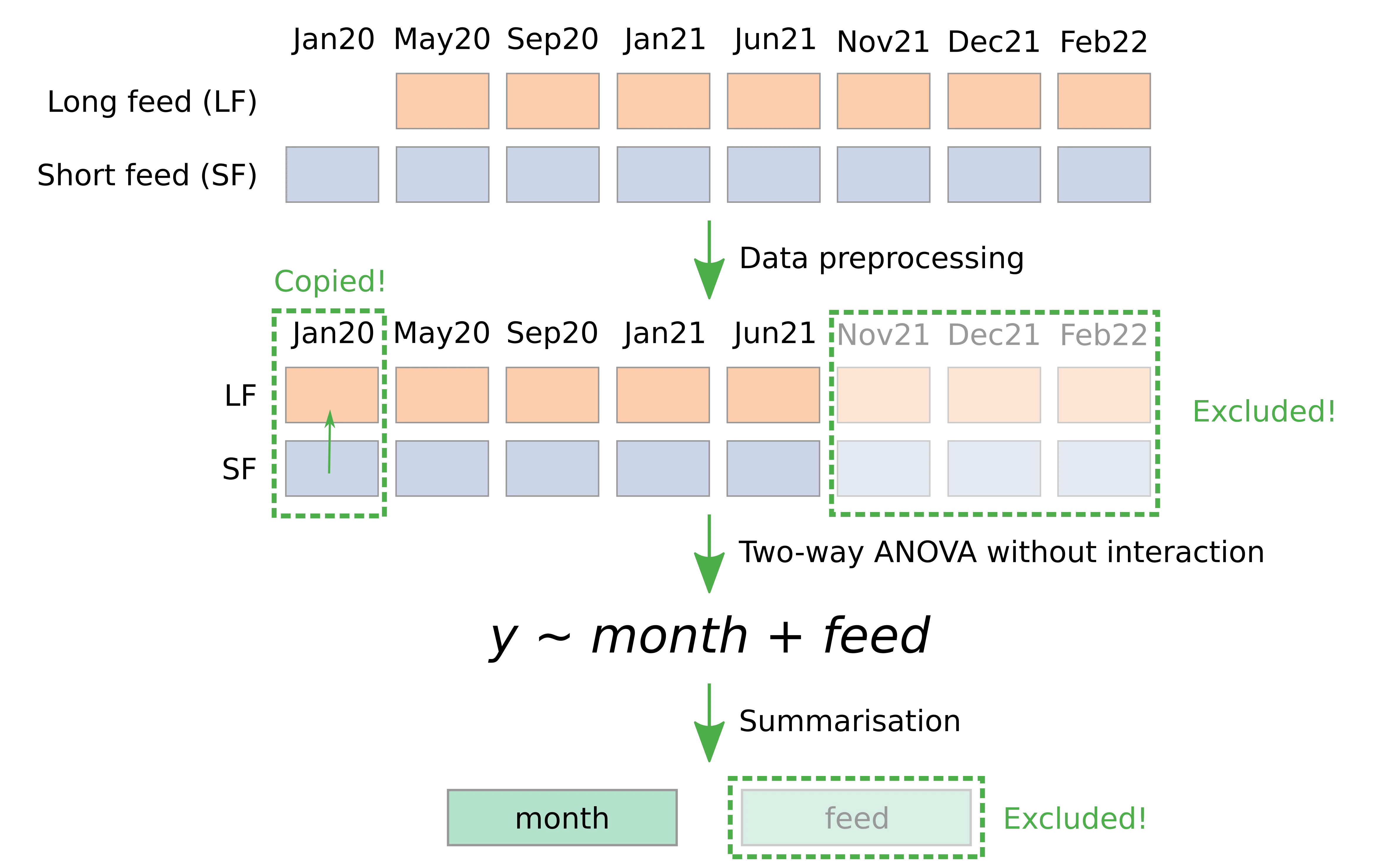 - Independent variables: month and feed.