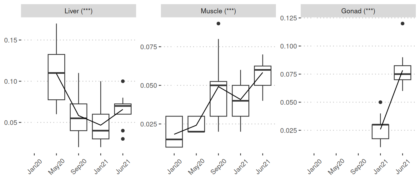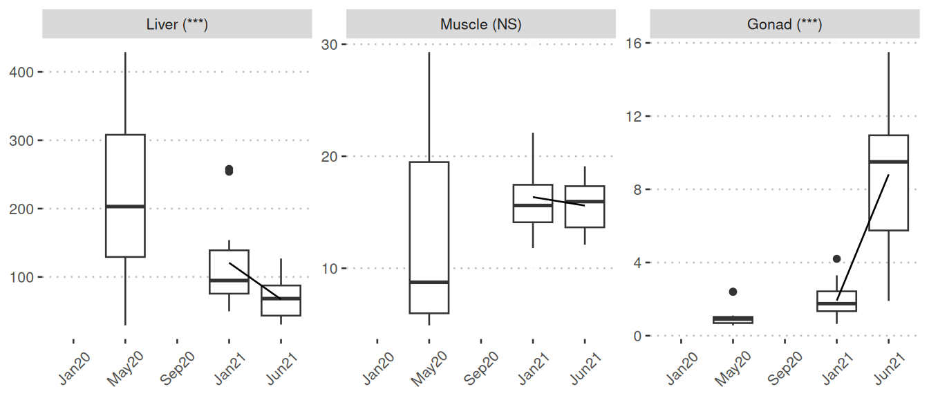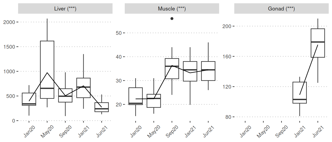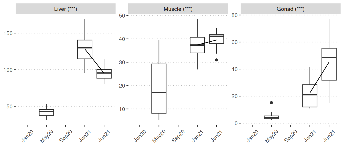 Significant: The boxplots visually represent nutrient/metabolite levels across five sampling points. These boxplots are only displayed when at least one comparison is identified as significant. The boxplots connect mean values of months through lines. The five sampling points are: