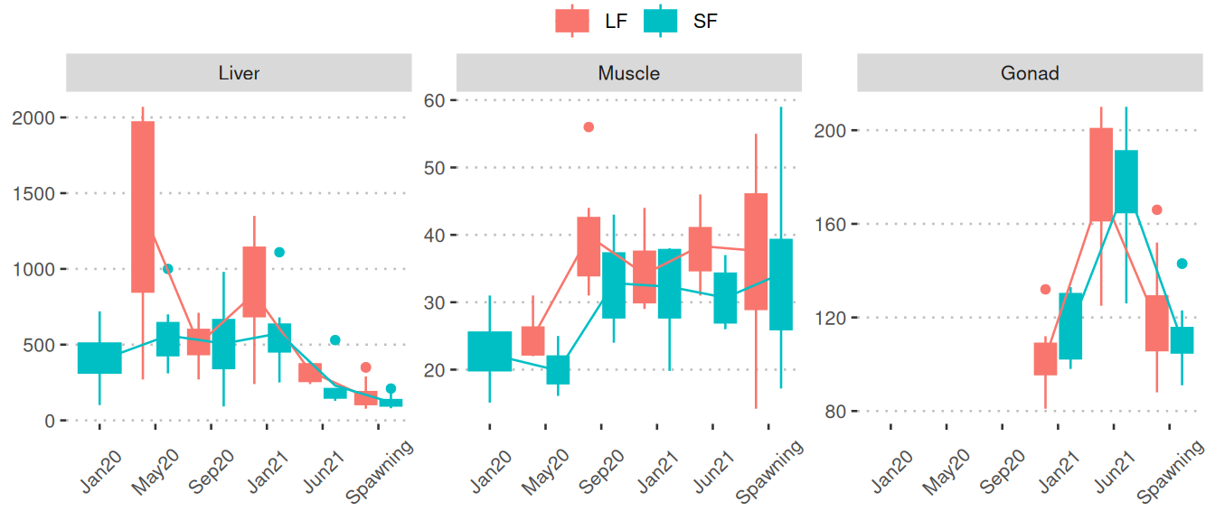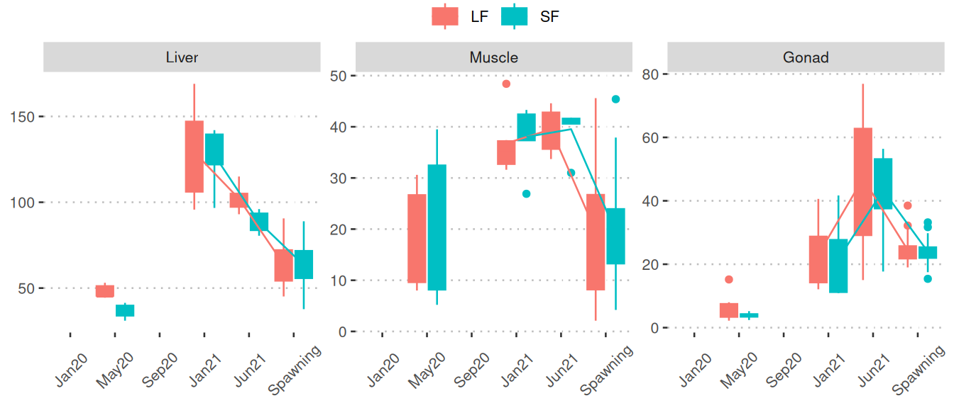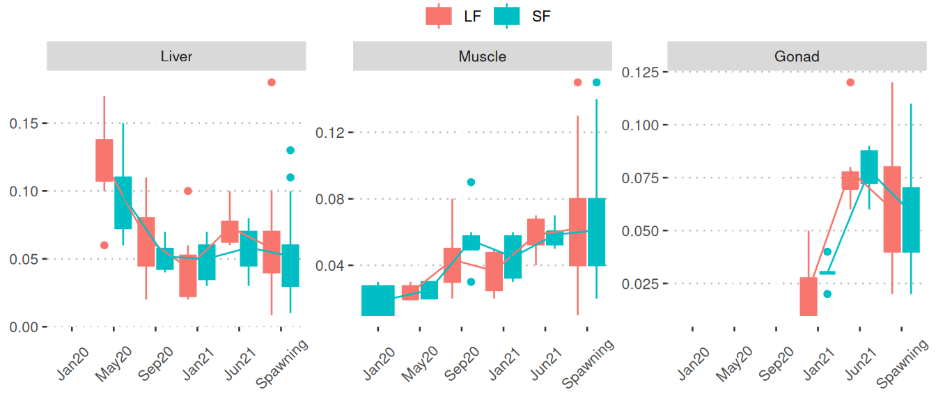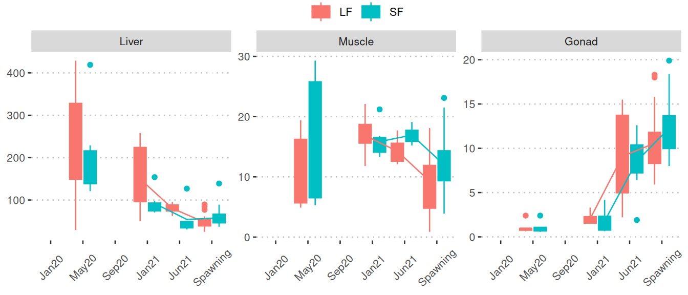 Boxplots of the phase 2 samples (spawning/offspring): Boxplots show nutrient/metabolite levels separated by LF (red) and SF (blue) among the three final sampling points for various tissues. Mean values of months are connected by lines. The final sampling points are categorized as: