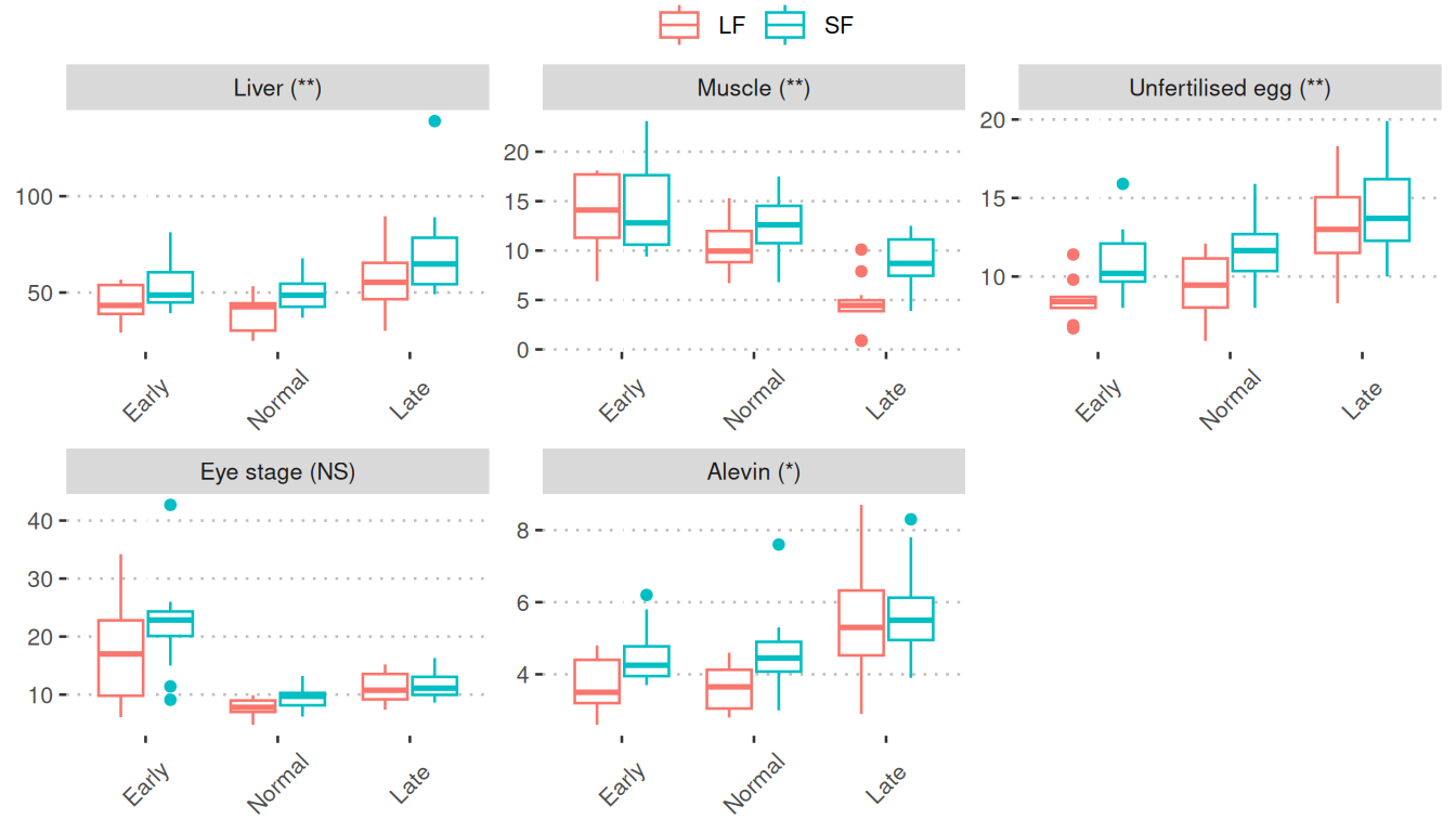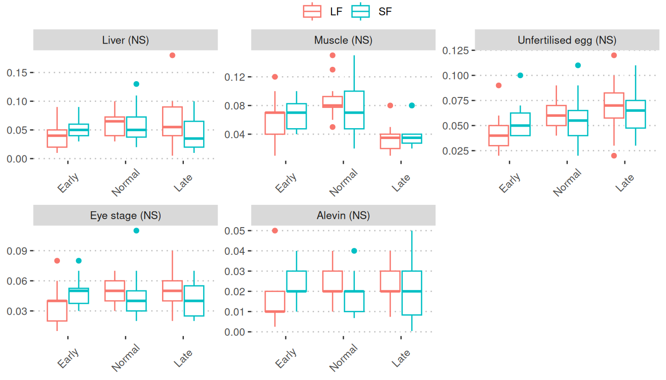 This page presents the findings from our analysis of spawning/offspring samples during the freshwater period, focusing on two different feed types. The two feed types are:
