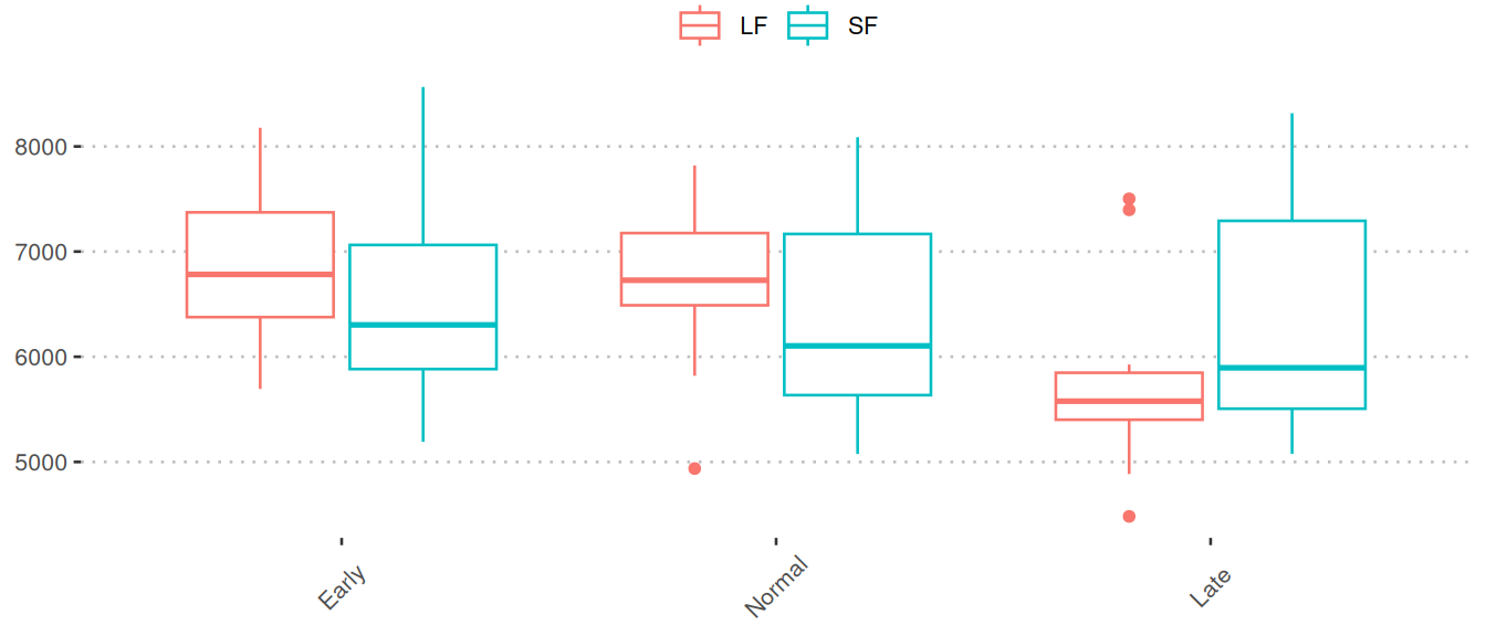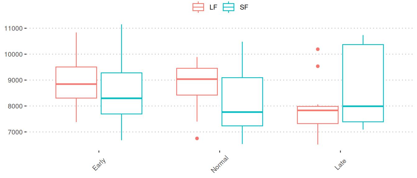 - Independent variables: month, feed, month:feed interaction.