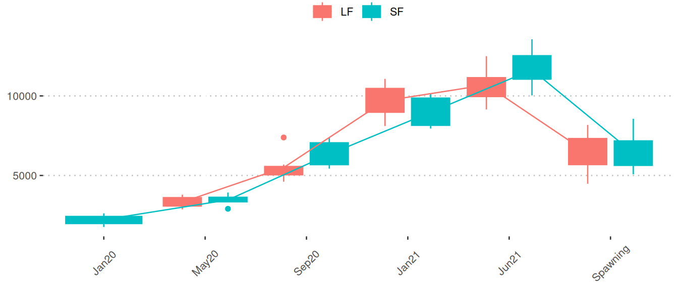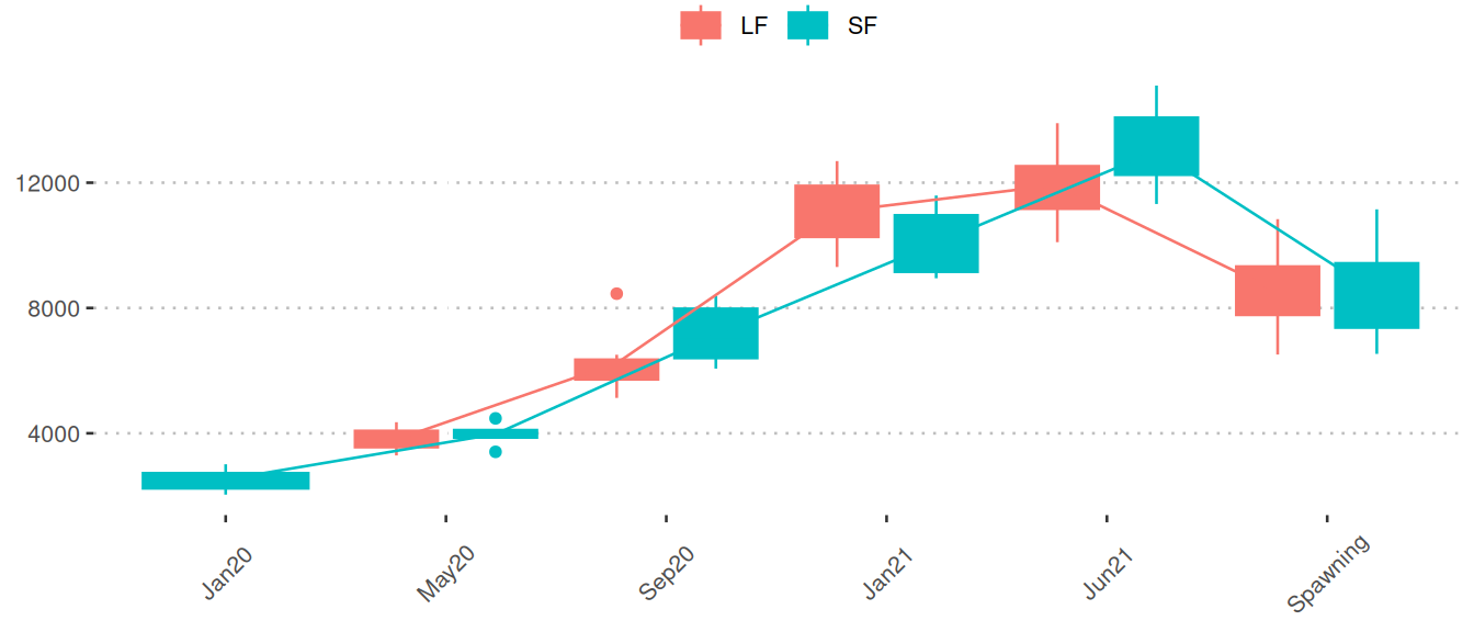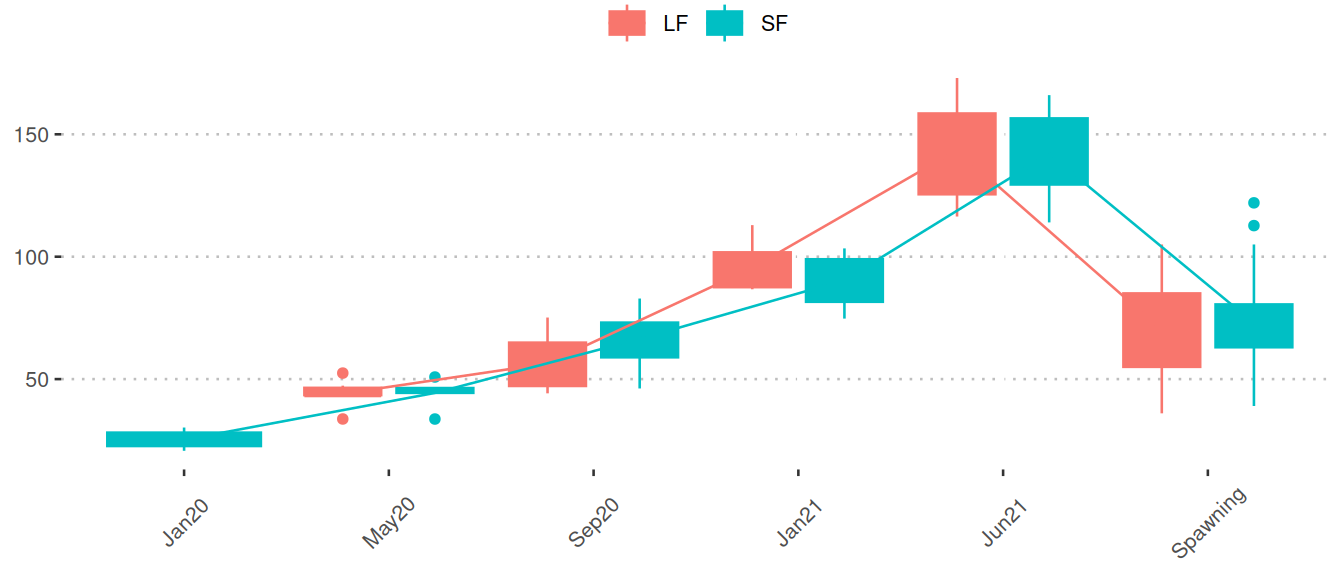 Boxplots of the phase 2 samples (spawning/offspring): Boxplots show measured weights separated by LF (red) and SF (blue) among the three final sampling points. Mean values of months are connected by lines. The final sampling points are categorized as: