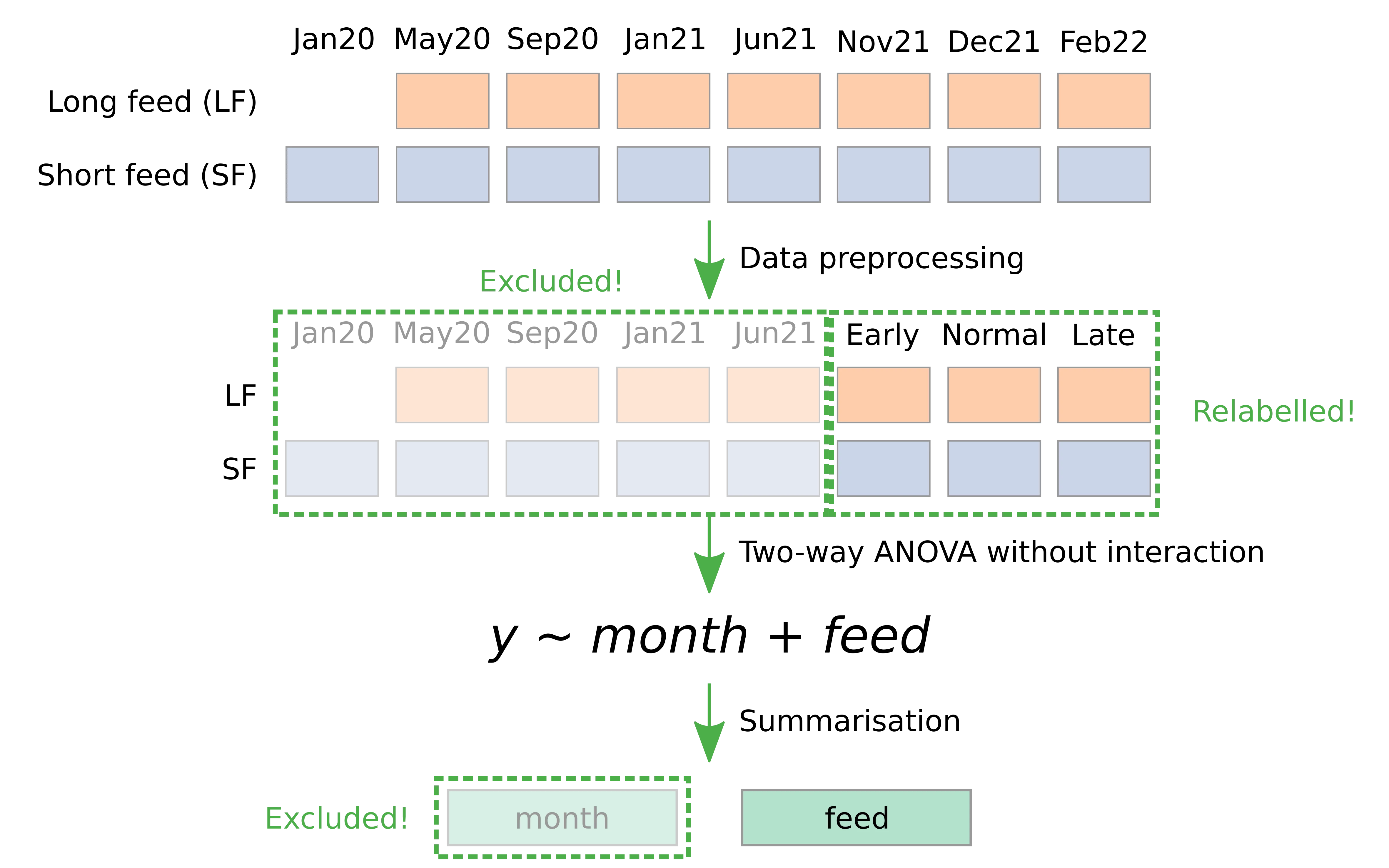 - Independent variables: month and feed.